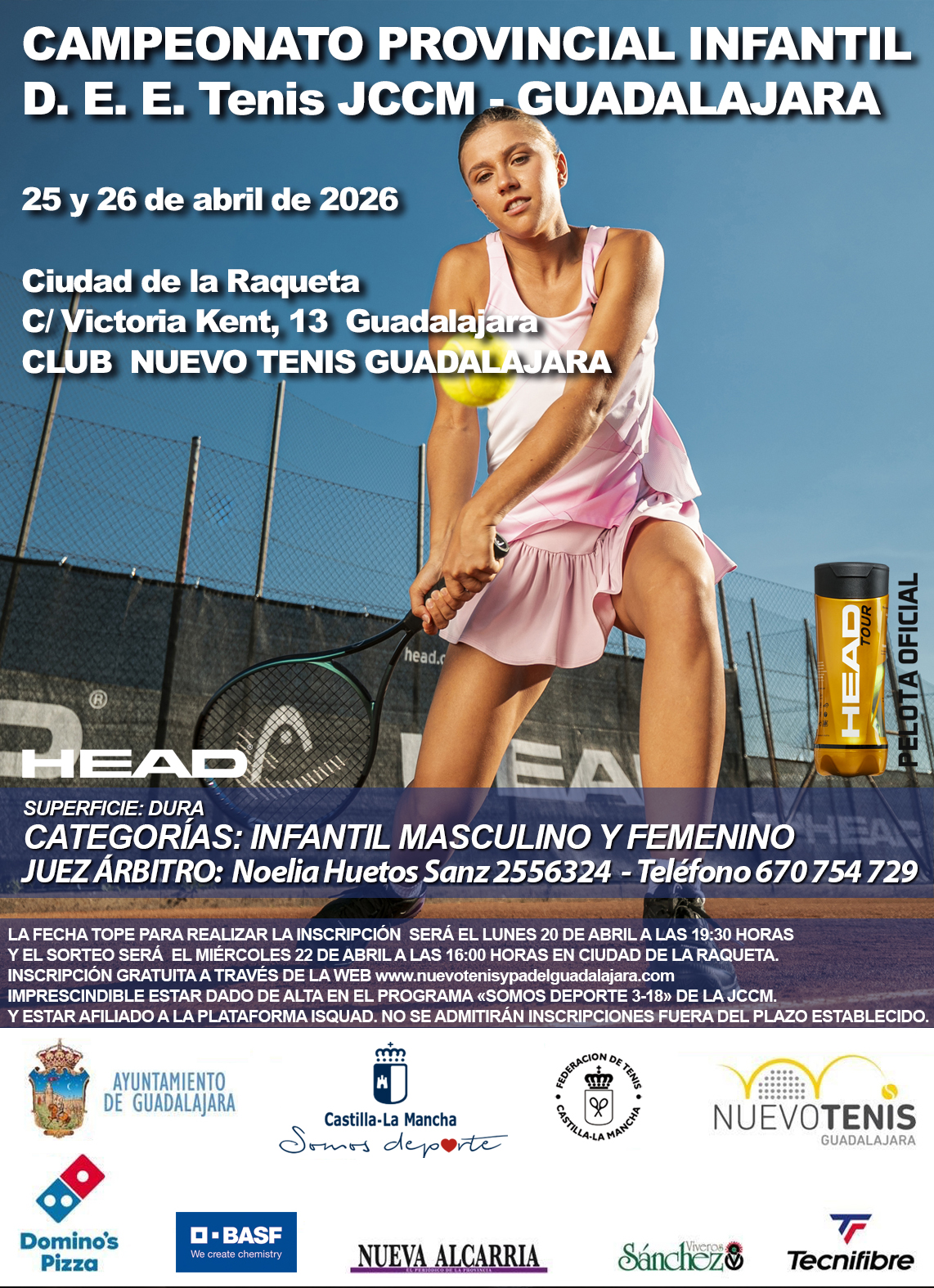 INSCRIPCIÓN GRATUITA A TRAVÉS DE LA WEB www.nuevotenisypadelguadalajara.com. IMPRESCINDIBLE ESTAR DADO DE ALTA EN EL PROGRAMA «SOMOS DEPORTE 3-18» DE LA JCCM.Y ESTAR AFILIADO A LA PLATAFORMA ISQUAD. NO SE ADMITIRÁN INSCRIPCIONES FUERA DEL PLAZO ESTABLECIDO.