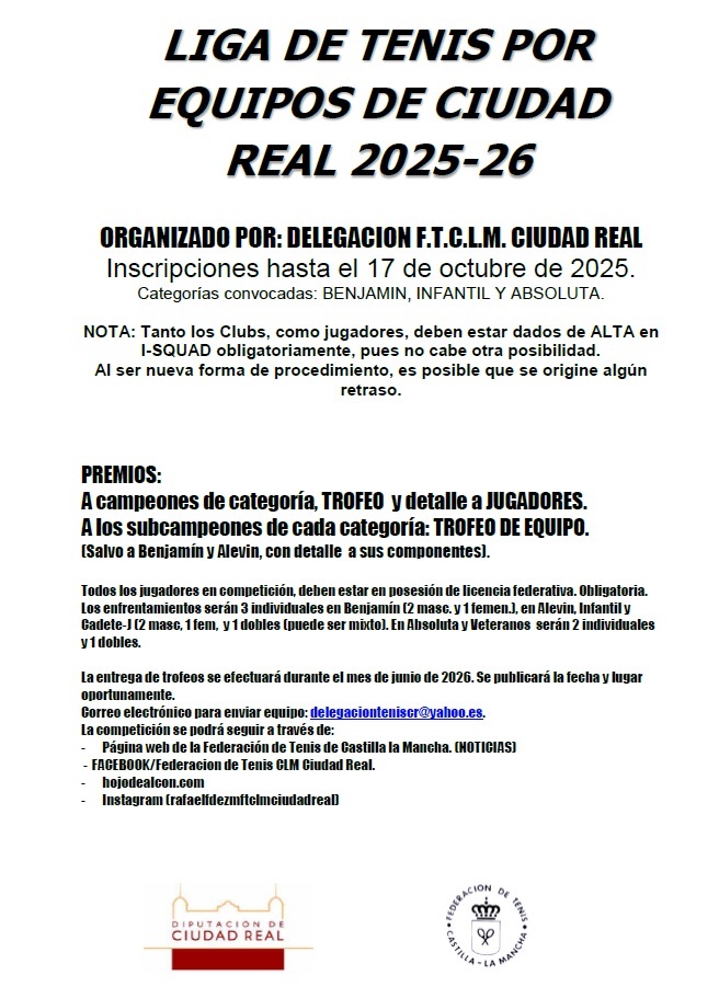 Se publica cartel de competición por equipos de Ciudad Real, organizado por la Delegación de la Federación, con la convocatoria de categorías BENJAMÍN, INFANTIL Y ABSOLUTA en ésta primera fase.