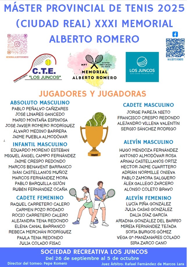 Se publica cartel y normas que rigen el torneo de tenis organizado por Sociedad Recreativa Los Juncos, en colaboración con la familia de Pepe Romero, que una edición más organizan con voluntad y en recuerdo de su hijo.